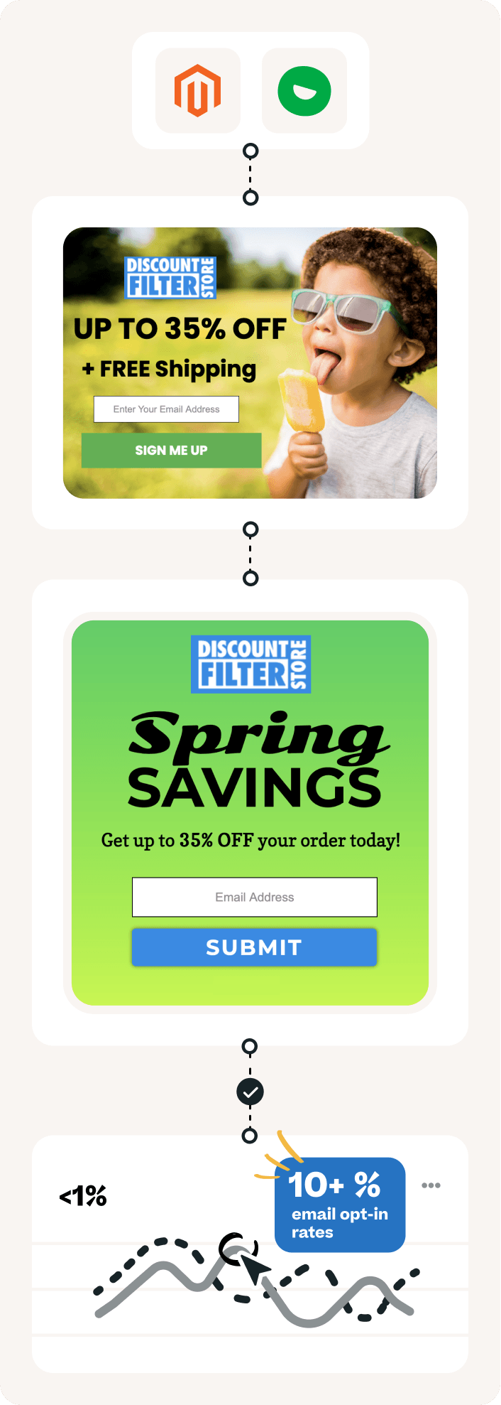 Contact UsWith Justuno, Discount Filter Store implemented a new email lead capture to drive near-instant results that carried over between their Magento 1 and 2 re-platforming, ESP migration from Bronto to Klaviyo, and more.