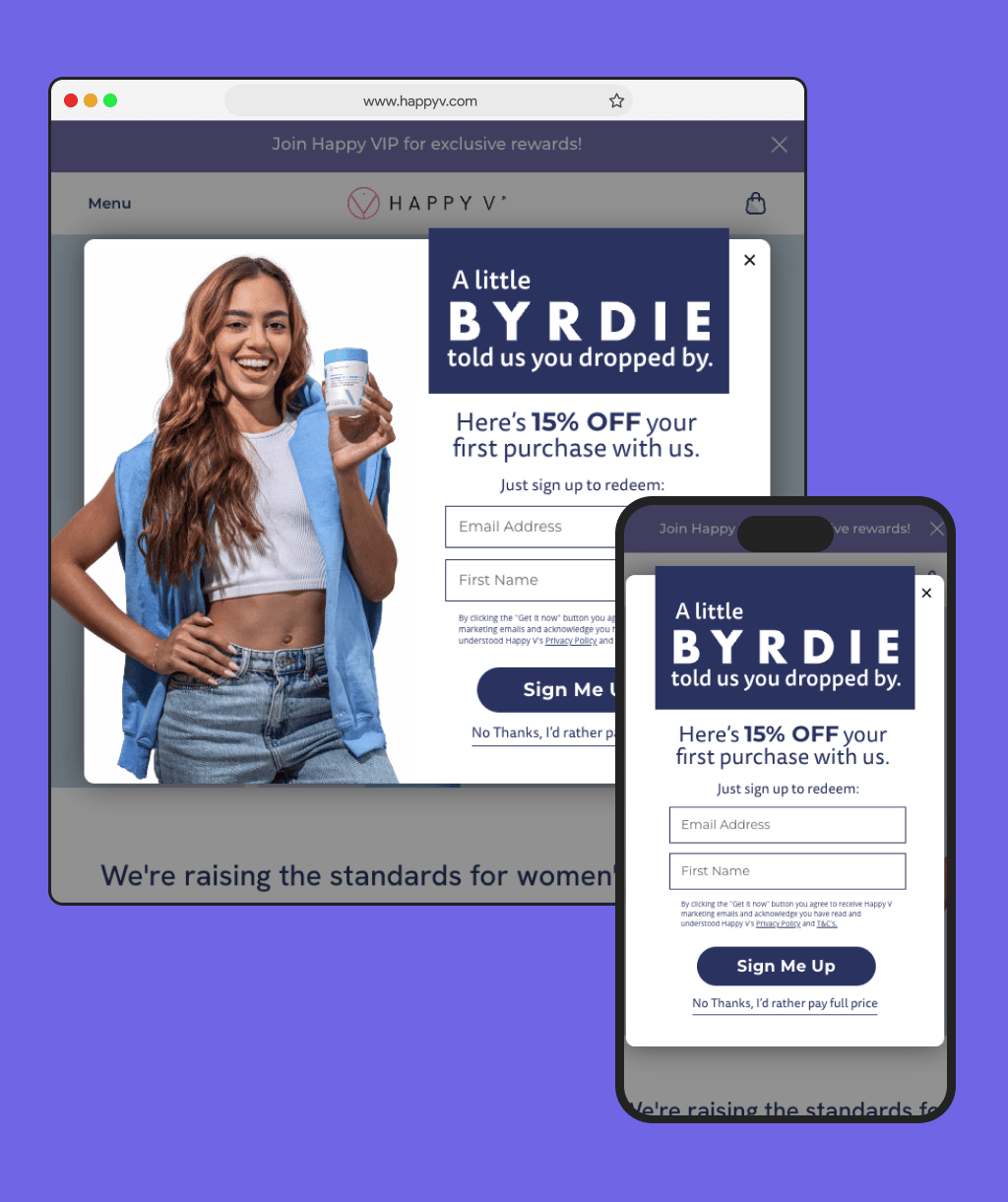 HappyV was able to grow its email list by 1400% during a period of explosive growth due to referral campaigns. By customizing their email popups to match their visitor’s referring traffic source they were able to cultivate a seamless experience. Those new subscribers led to a 230%+ growth in annual flow revenue as well!