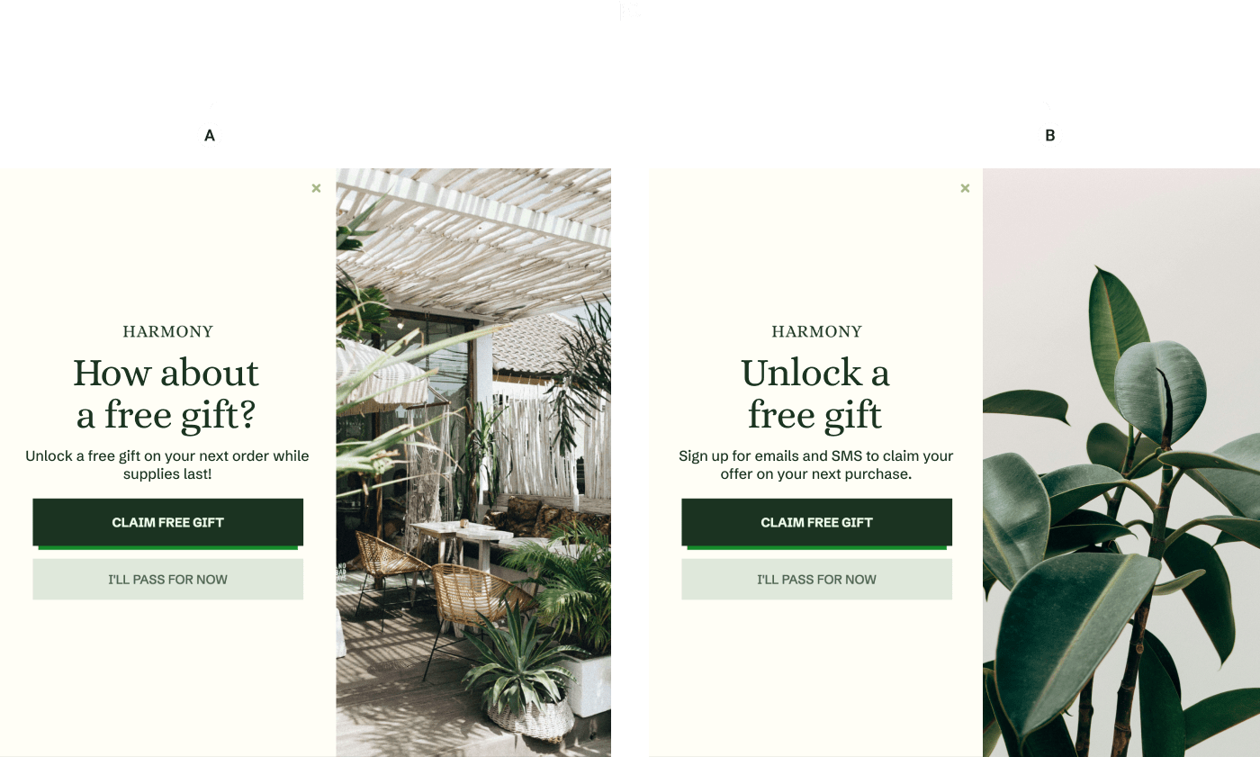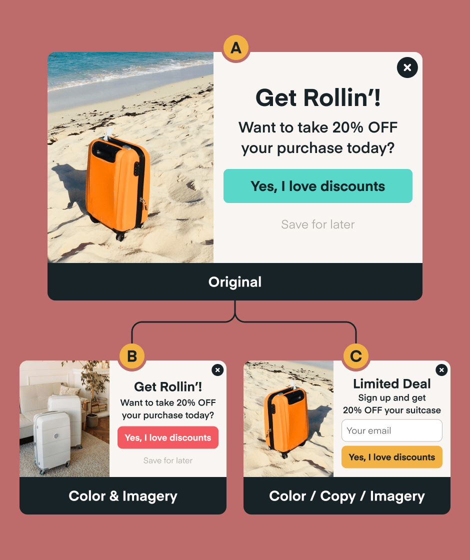 You should run tests based on what areas of your website experience you’re trying to optimize but a few examples of tests we see customers routinely perform are: various screen placements, imagery, copy, styles, and behavioral triggers. Our team can help you set up the right tests to meet your goals.