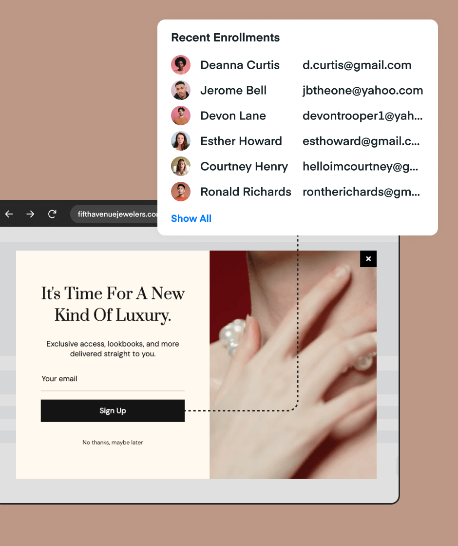 What does quality list growth mean for you? Better reach and campaign performance. Continuously grow your clients’ email and SMS lists with onsite lead captures that engage website visitors and seamlessly (and compliantly) collect email addresses and phone numbers.