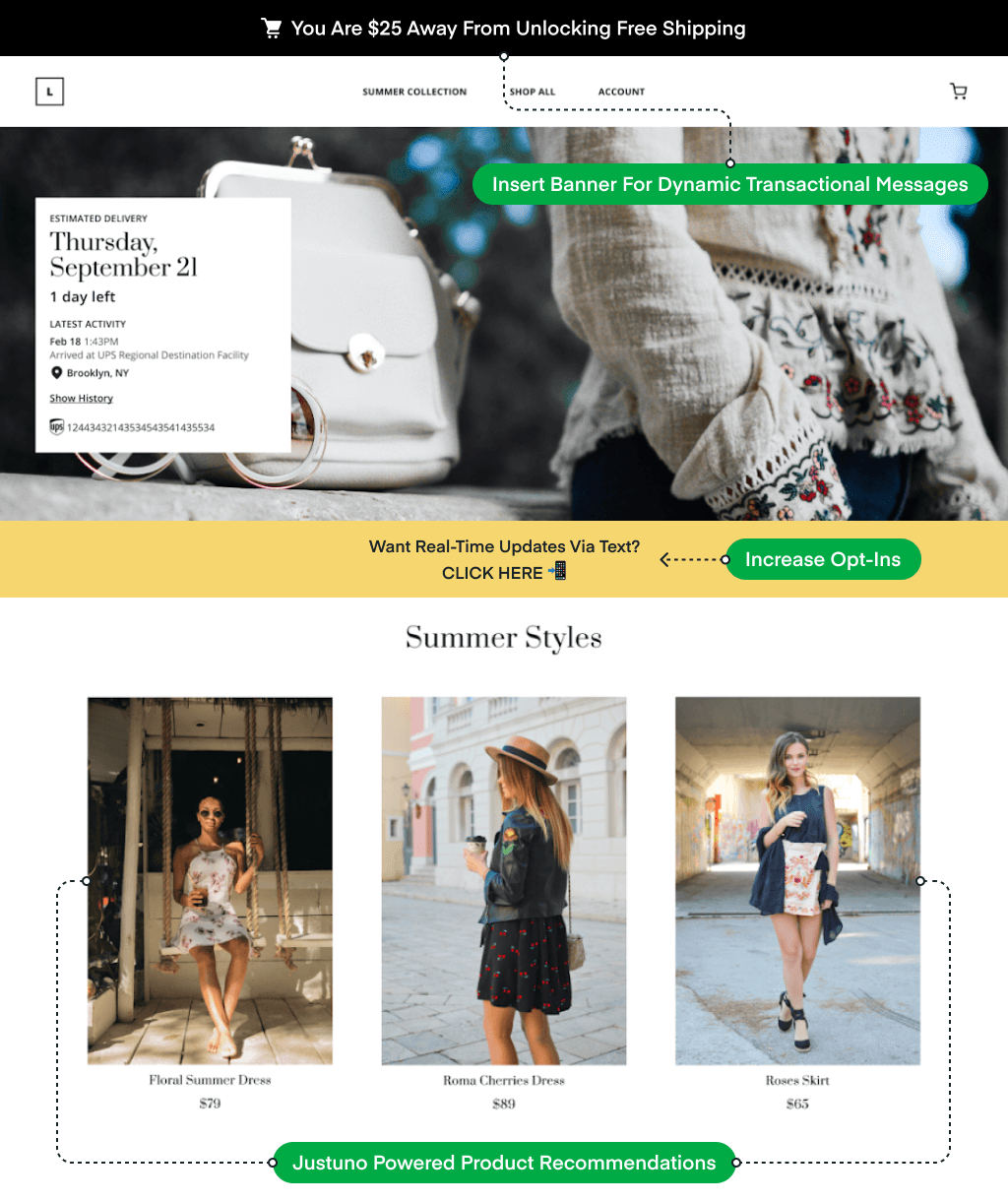 The ultimate scenario to come from the power couple of Justuno + Malomo is the cleanest and smoothest UX update for the post-purchase experience. When you create a branded tracking page and incorporate personalization tactics like seasonal styles, social channels, and product recommendations, you get the optimal chance to funnel customers into your top communication channels. The merchant approached their branded tracking page from a “mobile-first” perspective to create a minimalistic pop-up to gather more SMS opt-ins. They did this with a simple and trackable design that included the basics of a CTA to open the visitors’ texting app, known as tap-to-text, and a simple in-page view to make sure the opt-in looked native to the page.