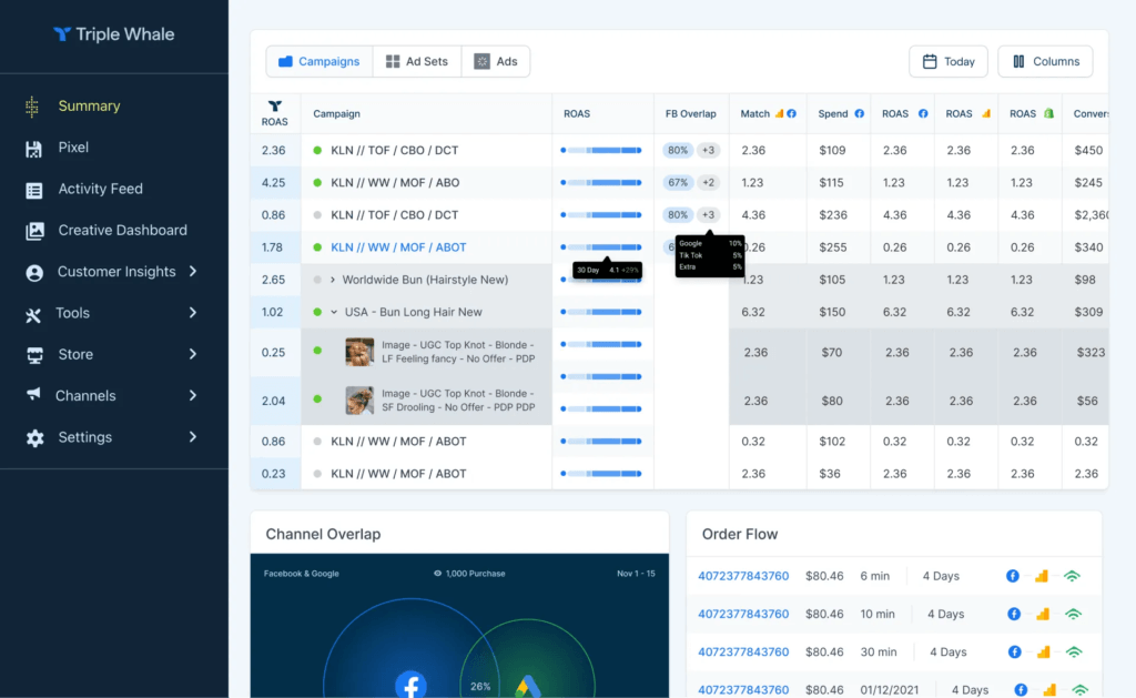 Triple Whale is a data platform that brings metrics and attribution that matter most to you. You can use their dashboards to make informed decisions about your spending and on-site and off-site strategies.