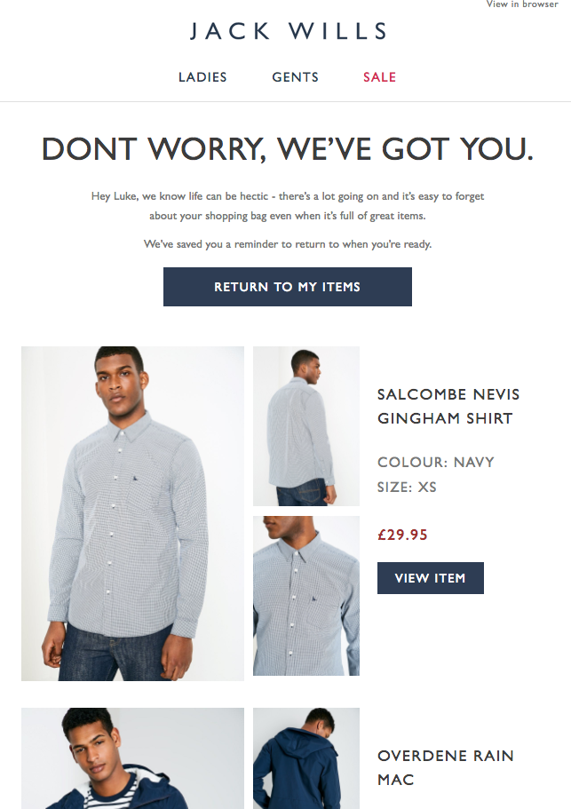 An effective cart abandonment series will send no more than three emails. Anything beyond this, you risk annoying the customer to the point they no longer feel an affinity with your brand.