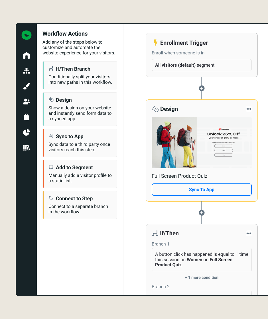 Justuno helps you build more than just a stand-alone quiz; plug them into your flow that powers the whole customer journey. Justuno’s powerful segmentation means starting with a quiz gives you the power to personalize every touchpoint afterward. From corresponding website experiences during the same session, at the next visit, or sync the data to the rest of your stack for off-site usage.