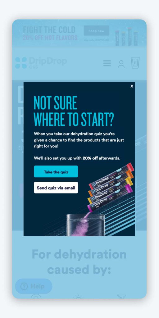 To round out their foundational promotions, DripDrop implemented an exit offer promoting their dehydration survey. This survey is designed to help DripDrop further segment website visitors with a deeper understanding of their dehydration causes and symptoms. This results in data-driven decisions on the type of content shared with customers and granular targeting with email and paid media campaigns.